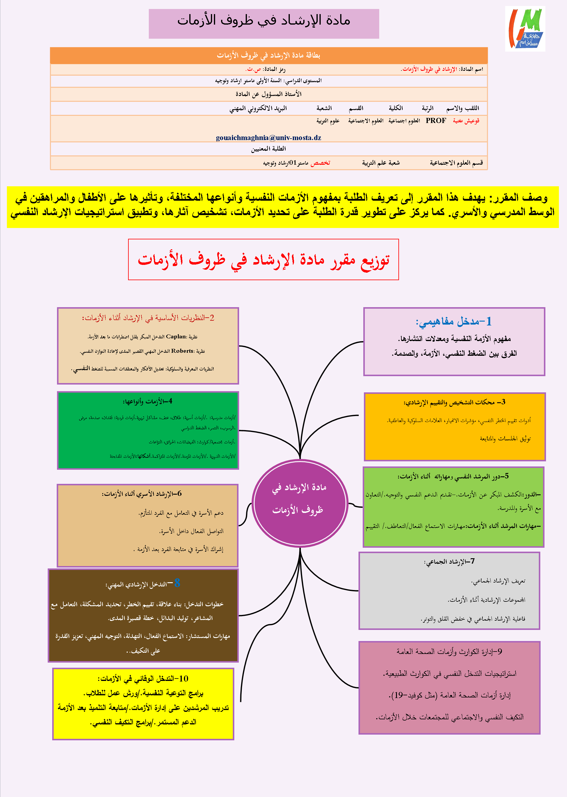 يهدف هذا المقرر إلى تعريف الطلبة بمفهوم الأزمات النفسية وأنواعها المختلفة، وتأثيرها على الأطفال والمراهقين في الوسط المدرسي والأسري. كما يركز على تطوير قدرة الطلبة على تحديد الأزمات، تشخيص آثارها، وتطبيق استراتيجيات الإرشاد النفسي الفردي والجماعي والأسري لمواجهتها. يشمل المقرر دراسة النظريات الأساسية، أدوات القياس والتشخيص، التدخل الوقائي، والمتابعة بعد الأزمة، بما يعزز التكيف النفسي والاجتماعي لدى المستفيدين.